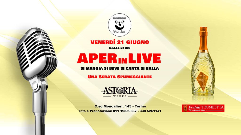 Questa settimana il Bamboo Garden Torino vi aspetta con due inaugurazioni, venerdì 21 giugno dalle ore 21.00 andrà in scena AperINlive, il nuovo apericena musicale con spettacolo animato e live music che farà divertire, cantare e ballare tutti colori che decideranno di partecipare, inoltre sarà una serata all’insegna delle bollicine con gli sponsor Astoria Wines e F.lli Trombetta che regaleranno un flute di benvenuto a tutti i prenotati.