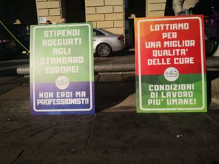 E le ragioni della protesta sono sintetizzate nei cartelli che il personale sanitario aveva in mano, a partire dall'adeguamento degli stipendi allo standard europeo. "Le nostre paghe - ha denunciato Francesco Coppolella, segretario regionale del Nursind - sono tra le più basse d'Europa. Ci sobbarchiamo a nostre spese l'assicurazione, la formazione e l'iscrizione all'ordine professionale". Se in Francia gli infermieri da marzo 2021 hanno percepito un aumento base di 183 euro, "noi attendiamo da due anni il riconoscimento, da 75 euro, per la lotta al Covid".