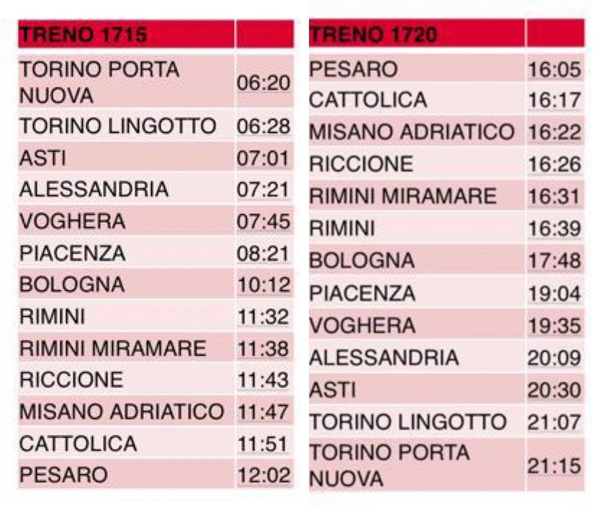 La partenza da Torino alle 6.20 (Asti alle 7.01 Alessandria alle 7.21 ) e le fermate intermedie solo a Voghera, Piacenza e Bologna, consentiranno un collegamento con l’alta velocità ma soprattutto tempi di percorrenza limitatissimi per un arrivo prima dell’ora di pranzo in Romagna, per poi raggiungere Pesaro poco dopo.