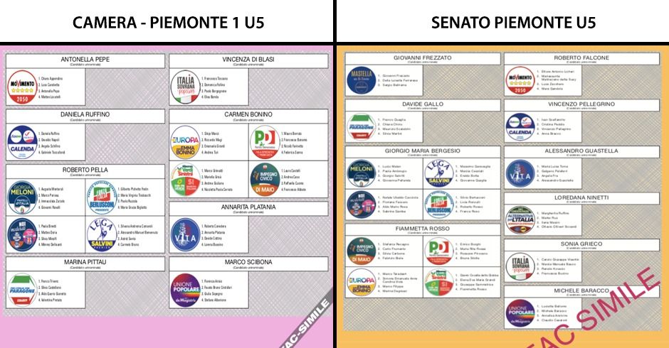 Mancano poco più di una settimana alle elezioni politiche del 25 settembre. Nella giornata di ieri, il Ministero dell’Interno ha divulgato i fac-simile delle schede che gli elettori di Torino e provincia troveranno alle urne per votare i candidati da eleggere alla Camera e al Senato.
