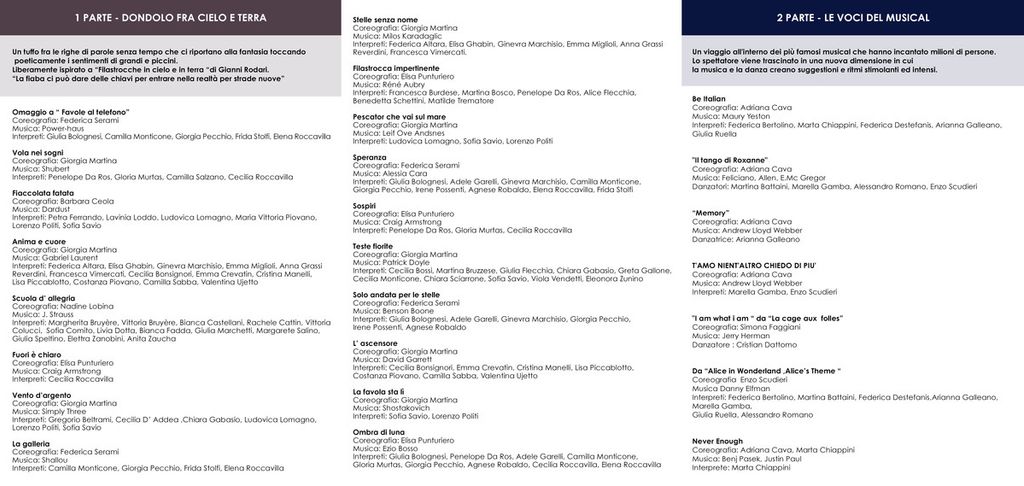 La prima parte dello spettacolo vedrà come protagonisti i ballerini de La Pirouette: la scuola di danza di Giorgia Martina andrà in scena con “Dondolo fra Cielo e Terra”, liberamente ispirato all'opera di Gianni Rodari “Filastrocche in cielo e in terra”, un tuffo fra le righe di parole senza tempo che ci riportano alla fantasia dei bimbi, toccando i sentimenti di grandi e piccini.