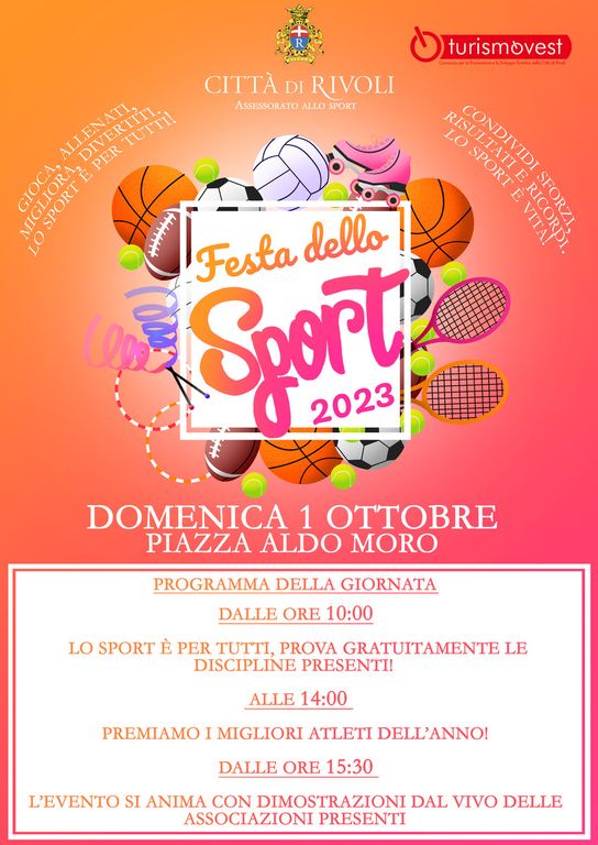 L’ Assessorato allo Sport del Comune di Rivoli, in collaborazione con Turismo Ovest e Consulta Comunale per lo Sport, propone domenica 1 ottobre in piazza Aldo Moro la “Festa dello sport”.