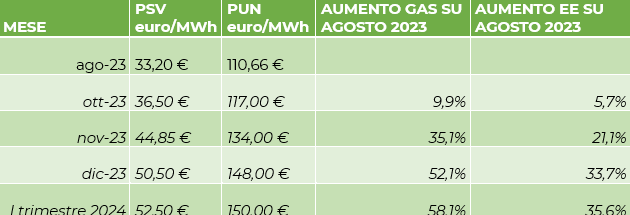 L’Osservatorio conferma la previsione rialzista fatta a inizio luglio per i prossimi due trimestri: un aumento della materia prima che potrebbe sfiorare il 60% per il GAS (PSV) e il 35% per l’energia elettrica (PUN).