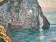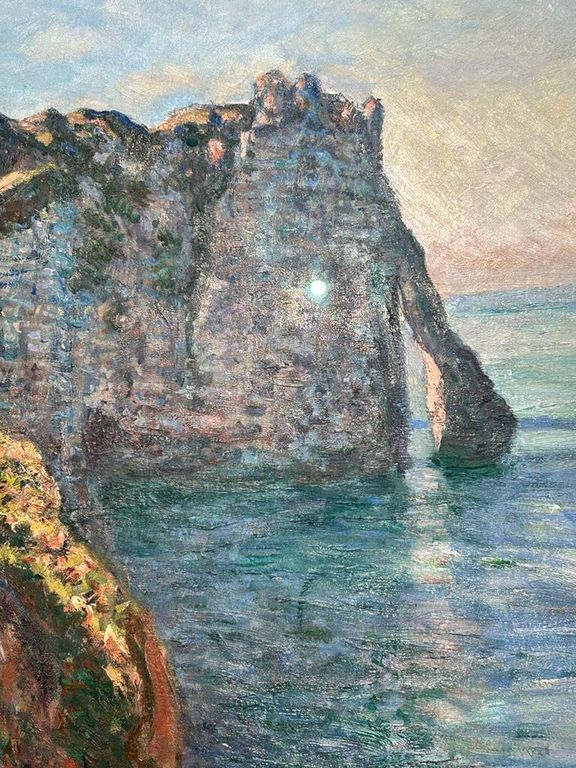 In La Falaise et la Porte d’Aval del Museum Barberini, lo sguardo dell’osservatore si muove, lungo una traiettoria a forma di arco, dalle scogliere illuminate dal sole in primo piano a sinistra verso il centro della composizione. Una materica pennellata di rosa intenso segna la breccia nella scogliera e crea un suggestivo accento cromatico, sottilmente echeggiato dai riflessi che si propagano sulla superficie dell’acqua. Come nella maggior parte delle tele dedicate alla costa atlantica, anche in questo caso il pittore ha scelto una scena deserta, priva di esseri umani, in modo da evocare un sentimento assoluto di contemplativa osservazione della natura.