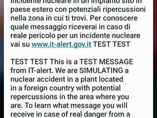 Questo il contenuto del messaggio, ripetuto anche in inglese: “TEST TEST Questo è un MESSAGGIO DI TEST IT-ALERT. Stiamo SIMULANDO un incidente nucleare in un impianto sito in paese estero con potenziali ripercussioni nella zona in cui ti trovi. Per conoscere quale messaggio riceverai in caso di reale pericolo per un incidente nucleare vai su www.it-alert.gov.it TEST TEST”