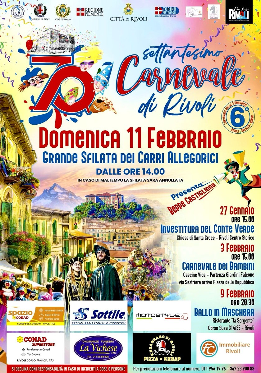 Rivoli torna a festeggiare il Carnevale con diversi eventi organizzati dalla Pro-Loco in collaborazione con alcune associazioni locali e con il sostegno delle attività del territorio. Un’organizzazione straordinaria che si inserisce nella programmazione turistica e culturale sostenuta dalla Città di Rivoli che apre le porte ad una 70° edizione ricca di sorprese ed allegria.
