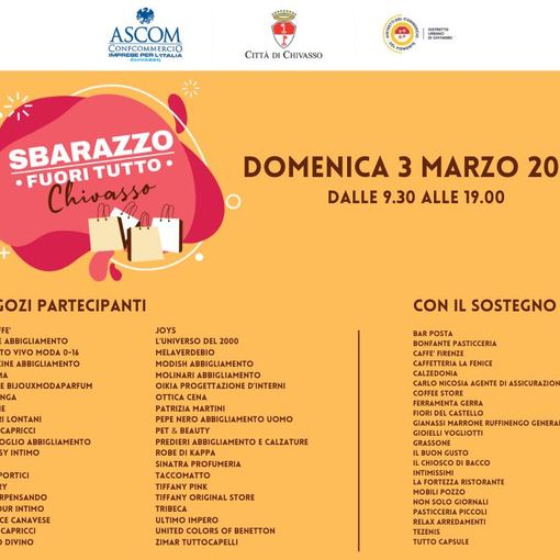 Raddoppia lo “Sbarazzo”: dopo il successo dello scorso settembre, ecco una nuova occasione di fare shopping approfittando delle imperdibili offerte dei negozi partecipanti, in un evento organizzato da Confcommercio Ascom Torino e Provincia, Ascom Chivasso con il Patrocinio della Città di Chivasso.