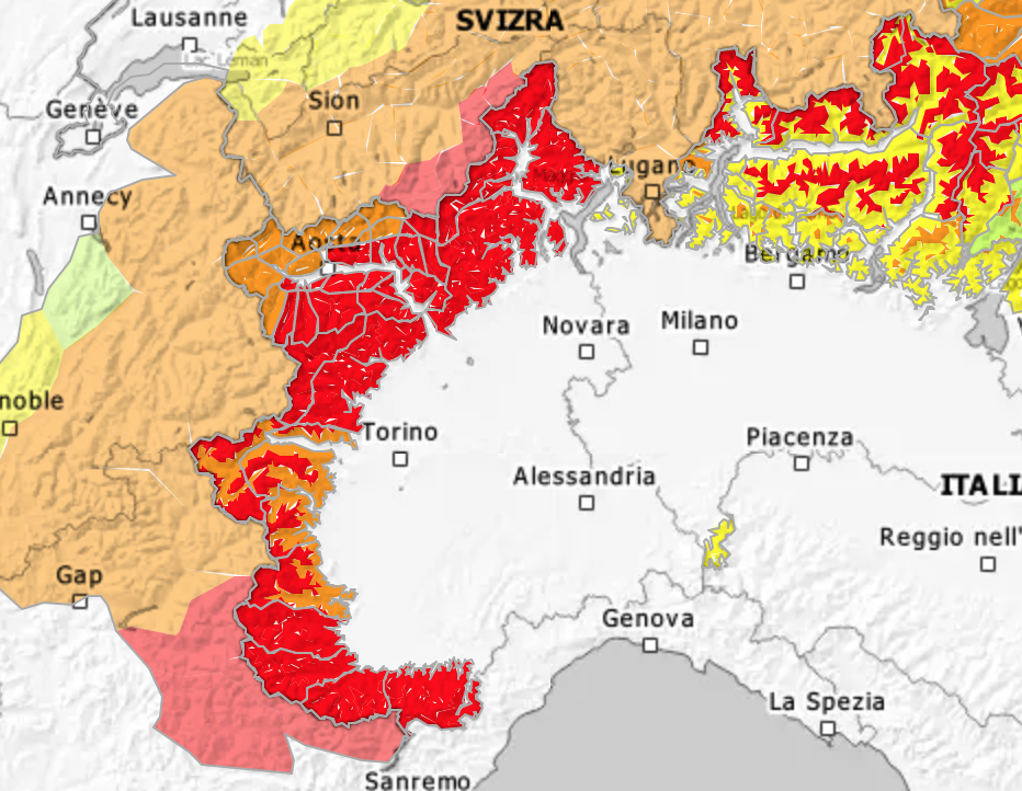 Scende a “marcato” solo in alcune aree delle Alpi Cozie. Occorre ad ogni modo prestare la massima attenzione viste le cospicue precipitazioni degli ultimi giorni. Nel resto del Piemonte l'allerta gialla è stata emessa per oggi sulle Valli Po, Infernotto, Varaita, Maira, Stura e Valle Tanaro.