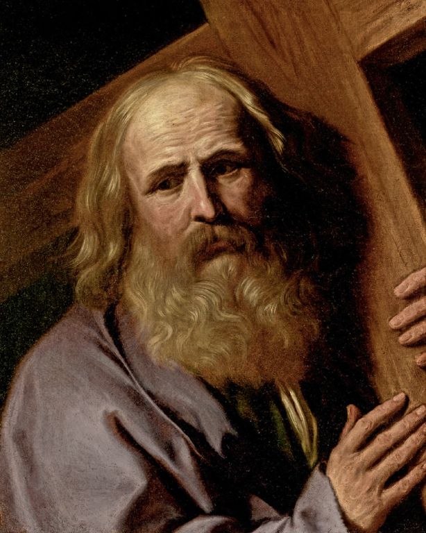 Il dipinto raffigura un sant’Andrea avanti negli anni, con barba e capigliatura fluenti, mentre fissa con lo sguardo velato da una lieve malinconia un punto indistinto al di fuori della tela. L’apostolo regge tra le mani come senza sforzo la croce a X, suo strumento di martirio e consueto attributo iconografico. Le dimensioni ridotte della tela e l’atmosfera di intimo raccoglimento lasciano intuire che l’opera fosse destinata alla devozione privata. La materia lavorata, la pennellata morbida e leggermente chiaroscurata collocano l’opera all’interno del quinto decennio del Seicento, periodo coincidente con il trasferimento del pittore a Bologna dalla natia Cento insieme alla sua fiorente bottega.