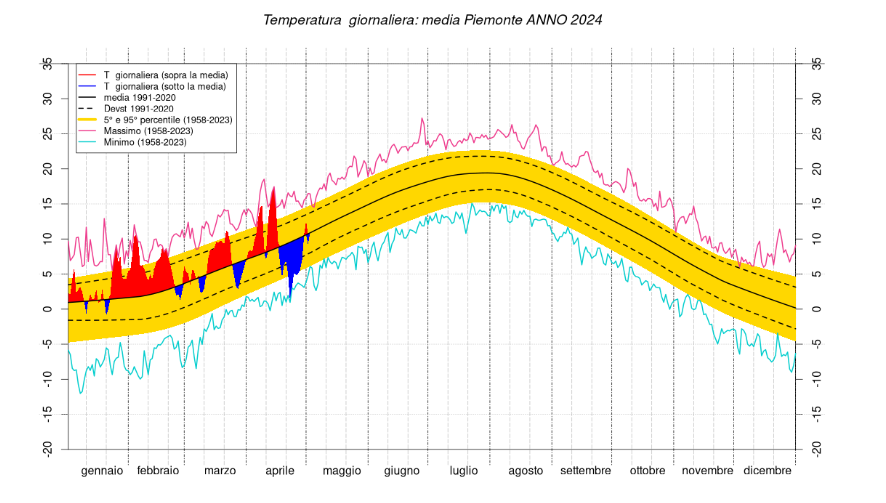 Ma tutto questo non basta. Anche all'occhio più distratto non può sfuggire come, dall'inizio del 2024 a oggi, siano molte di più le situazioni in cui le temperature sono schizzate verso l'alto. Molto verso l'alto. E' ancora lo schema statistico di Arpa Piemonte a spiegare la situazione: tutto febbraio, ma anche buona parte di gennaio e marzo hanno regalato massime decisamente superiori alla media. Così come la parte centrale di marzo e la prima metà di aprile.