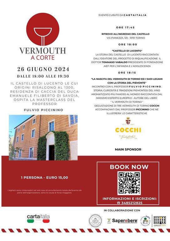 In questo spazio, mercoledì 26 giugno 2024 alle 18:00 si terrà una nuova tappa di Vermouth a Corte, prestigioso evento dedicato al vino aromatizzato più famoso al mondo nato a Torino nel 1786; l’appuntamento è nell’ambito della terza edizione della Vermouth di Torino Week, un’iniziativa ideata dal Consorzio del Vermouth di Torino che si celebra da domenica 23 fino a domenica 30 giugno 2024.