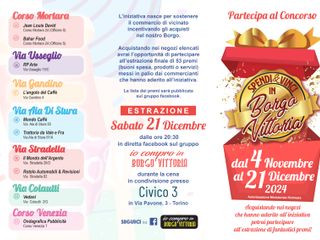 Quest'anno, dal 4 novembre al 21 dicembre per ogni acquisto fatto nei negozi che aderiscono all'iniziativa nel quartiere Borgo Vittoria a Torino, verrà dato un biglietto da compilare con nome, cognome e numero telefonico, basterà inserirlo nell'apposita scatola. Ne sarà presente una per ciascuna attività e il 21 dicembre tutti i biglietti contenuti nelle 54 scatole presenti negli esercizi commerciali, saranno inseriti in un'unica scatola grande e il 21 dicembre dalle ore 20.30, durante una cena in condivisione con i commercianti stessi, ci sarà l'estrazione in diretta fb sul gruppo "Io Compro In Borgo Vittoria". Ma non finisce qui, perchè ci sarà l'estrazione di un super premio finale: i fortunati vincitori si aggiudicheranno una crociera per 2!!!