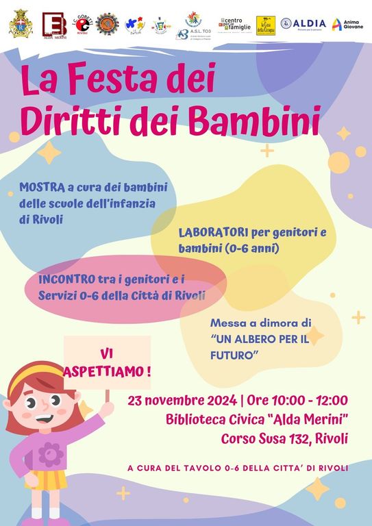 La Città di Rivoli è lieta di annunciare la Festa dei Diritti dei Bambini, che si terrà sabato 23 novembre, dalle ore 10 alle 12, presso la Biblioteca Comunale di Corso Susa 132.