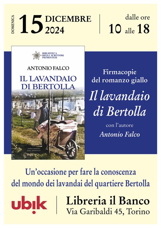 Domenica 15 dicembre dalle 10 alle 18 , presso la Libreria Ubik Il Banco di via Garibaldi 45 a Torino, si terrà il firmacopie con l’autore Antonio Falco.