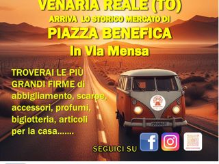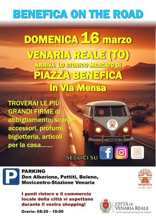 Dopo i successi nelle piazze delle città piemontesi PIAZZA BENEFICA ON THE ROAD arriva a Venaria Reale, con il patrocinio della Città di Venaria Reale, con nuove proposte, dalle 8,30 alle 19, dove gli storici stocchisti e ambulanti di Piazza Benefica porteranno le migliori marche e firme di abbigliamento, calzature, accessori, profumi, bigiotteria e articoli per la casa Made in Italy con oltre 50 espositori per accontentare tutti i gusti e le esigenze di stile e di moda dei visitatori.