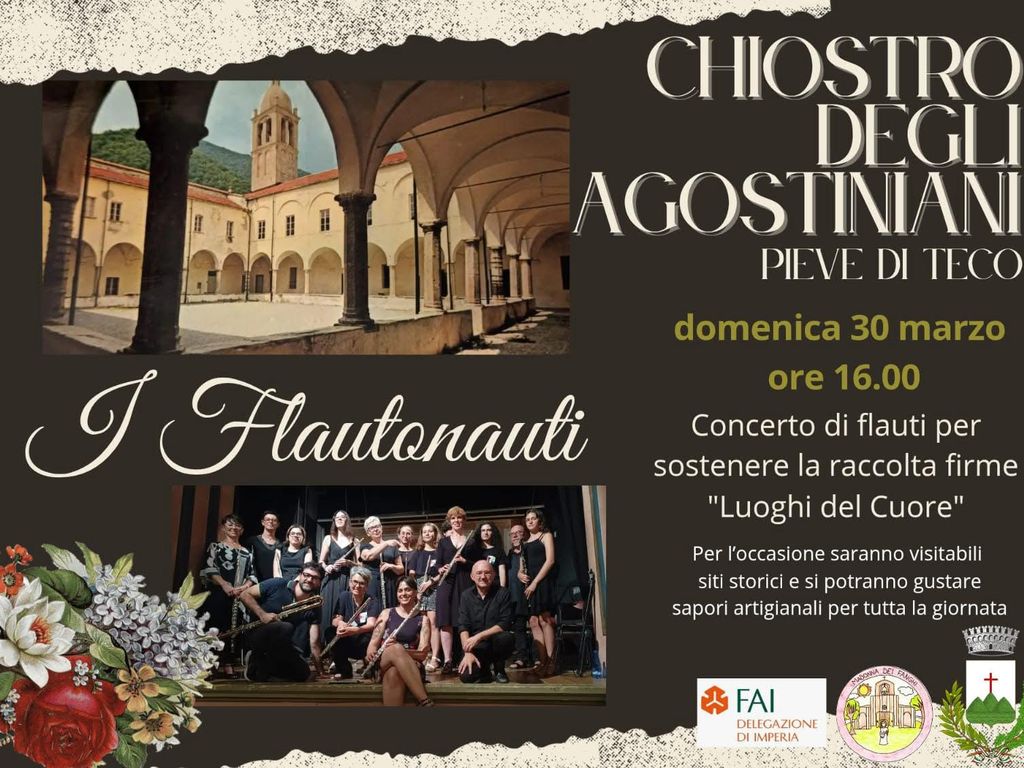 Il Comitato Madonna dei Fanghi, promotore della candidatura del Chiostro degli Agostiniani di Pieve di Teco, al 12 Censimento FAI per “I luoghi cuore”, in vista della chiusura della raccolta firme prevista per il 10 Aprile 2025, per ringraziare tutti coloro che firmando hanno permesso di raggiungere un risultato inimmaginabile ( ad oggi 4.383 firme, quarti in Liguria ) ha organizzato per domenica 30 Marzo alle ore 16.00, presso il Chiostro stesso, il concerto dei “Flautonauti”, un gruppo di giovanissimi artisti.