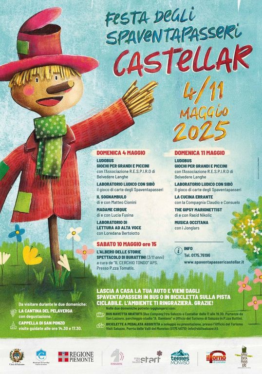 Gli spaventapasseri, simbolo di protezione e sostenibilità, invitano i tanti turisti a raggiungere Castellar con i bus navetta gratuiti (da Saluzzo e ritorno ore 11/19,30: San Lazzaro, parcheggio stadio “A. Damiano e P.zza Buttini) o con le biciclette a pedalata assistita a noleggio su prenotazione presso l’Ufficio del Turismo Visit Saluzzo, Porta delle Valli del Monviso (0175/46710; info@visitsaluzzo.it)