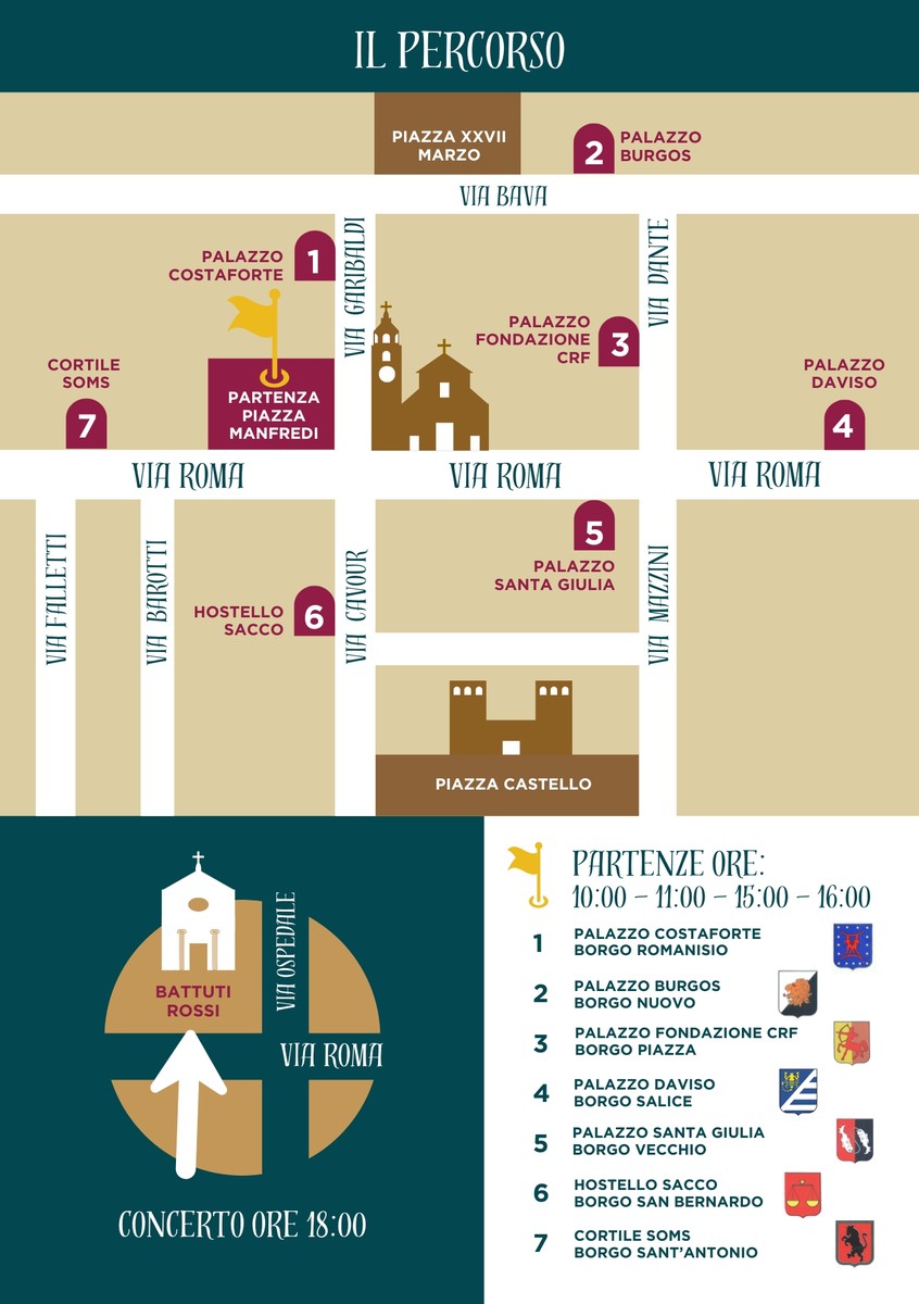 Sette tappe animate dai figuranti del Corteo storico in rappresentanza dei Borghi cittadini, con gli Sbandieratori e Musici dei Principi d'Acaia e musicisti della FFM.