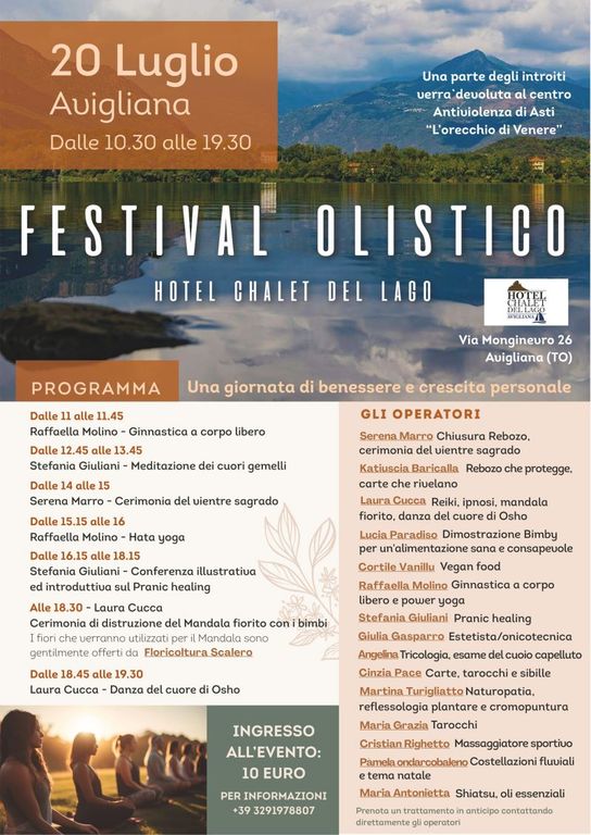 Vuoi ritrovare equilibrio e benessere in una cornice incantata? Immagina un luogo dove il tempo rallenta, dove il respiro si fa più profondo e la mente si libera. Non è un sogno, ma il Festival Olistico di Avigliana, che ti aspetta domenica 20 luglio 2025 all'incantevole Hotel Chalet del Lago. Dalle 10:30 alle 19:30, preparati a immergerti in una giornata interamente dedicata al tuo benessere e alla tua crescita personale.