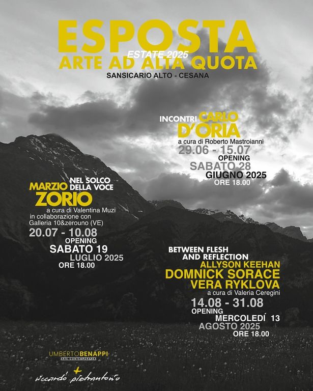 Si parte Sabato 19 Luglio alle ore 18.00: Galleria Umberto Benappi - Sansicario Alto : secondo appuntamento della rassegna estiva 2025: ESPOSTA. ARTE AD ALTA QUOTA, con la Mostra “Nel solco della voce” Mario Zorio a cura di Valentina Muzi in collaborazione con Galleria 10& zerouno Venezia