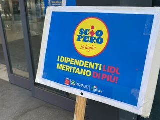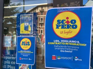 Sciopero nazionale di 8 ore per i dipendenti Lidl. A Torino il presidio è stato organizzato davanti al punto vendita di via Bologna 120 dalle sigle di Filcams, Fisascat e Uiltucs.