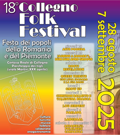Fino al 7 settembre, il Parco della Certosa di Collegno si trasforma in un punto d'incontro tra Romania e Piemonte in occasione della 18ª edizione del Folk Festival. L'evento, promosso dall'associazione interculturale "Diversi ma Uguali", celebra l'integrazione culturale e la solidarietà attraverso musica, cibo e valori condivisi.