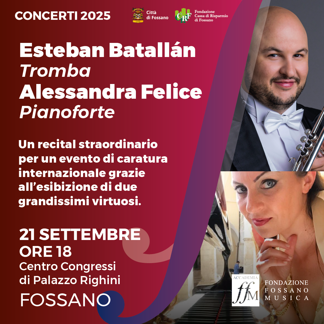 Un evento di caratura internazionale approda a Fossano: Esteban Batallán Cons, considerato tra i più grandi trombettisti della scena mondiale e prima tromba della Chicago Symphony Orchestra, sarà protagonista di un recital straordinario insieme alla pianista Alessandra Felice. Il concerto, in programma domenica 21 settembre alle ore 18:00 presso il prestigioso Centro Congressi di Palazzo Righini, offrirà al pubblico un viaggio appassionante attraverso alcune delle pagine più significative del repertorio per tromba e pianoforte.