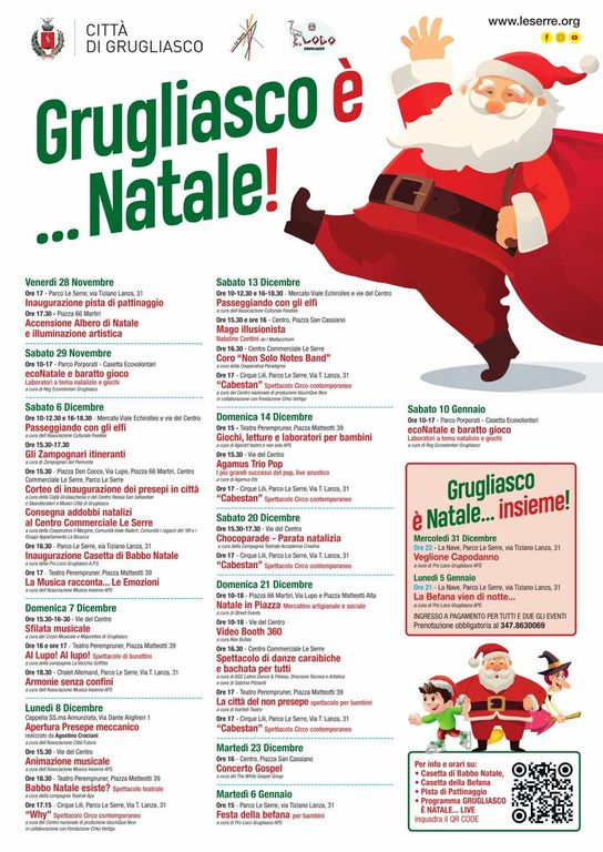Il consiglio? Date uno sguardo al programma completo nella sezione "News & Eventi" del sito www.leserre.org e non perdetevi nemmeno una delle proposte. Troverete anche tutti gli appuntamenti di "Grugliasco è Natale… Insieme", "Grugliasco è Natale… Live" e “Grugliasco è Natale… in borgata”.