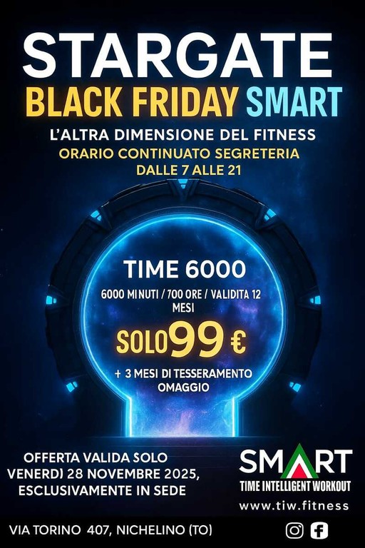 Sei pronto a varcare la soglia del fitness intelligente? SMART TIW - Time Intelligent Workout di Nichelino lancia una promozione "fuori dal tempo" per il Black Friday che è un vero e proprio viaggio dimensionale verso la tua forma fisica.