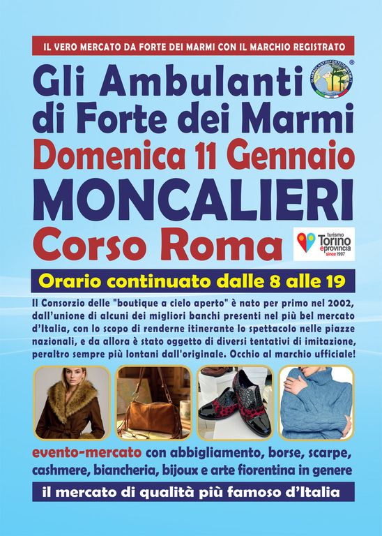 Come ormai da tradizione, il nuovo anno porta con sé l’attesissima presenza de Gli Ambulanti di Forte dei Marmi® - le bancarelle del mercato di qualità più famoso d’Italia, da non confondere con alcuni tentativi di imitazione del loro originale format che circolano in regione - che tornano a grandissima richiesta nell’area della Città Metropolitana di Torino con il loro show itinerante all’insegna del meglio del Made in Italy artigianale e delle ultime tendenze della moda. Si potranno infatti ammirare le ormai mitiche boutique a cielo aperto® dell’originale Consorzio domenica 11 gennaio a MONCALIERI, in Corso Roma. Dunque, un’occasione da non perdere assolutamente per i tanti appassionati del genere, che l’hanno a lungo reclamata: una rassegna dello shopping più glamour e conveniente, con orario continuato, anche in caso di maltempo, dalle 8 alle 19.