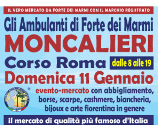 Come ormai da tradizione, il nuovo anno porta con sé l’attesissima presenza de Gli Ambulanti di Forte dei Marmi® - le bancarelle del mercato di qualità più famoso d’Italia, da non confondere con alcuni tentativi di imitazione del loro originale format che circolano in regione - che tornano a grandissima richiesta nell’area della Città Metropolitana di Torino con il loro show itinerante all’insegna del meglio del Made in Italy artigianale e delle ultime tendenze della moda. Si potranno infatti ammirare le ormai mitiche boutique a cielo aperto® dell’originale Consorzio domenica 11 gennaio a MONCALIERI, in Corso Roma. Dunque, un’occasione da non perdere assolutamente per i tanti appassionati del genere, che l’hanno a lungo reclamata: una rassegna dello shopping più glamour e conveniente, con orario continuato, anche in caso di maltempo, dalle 8 alle 19.