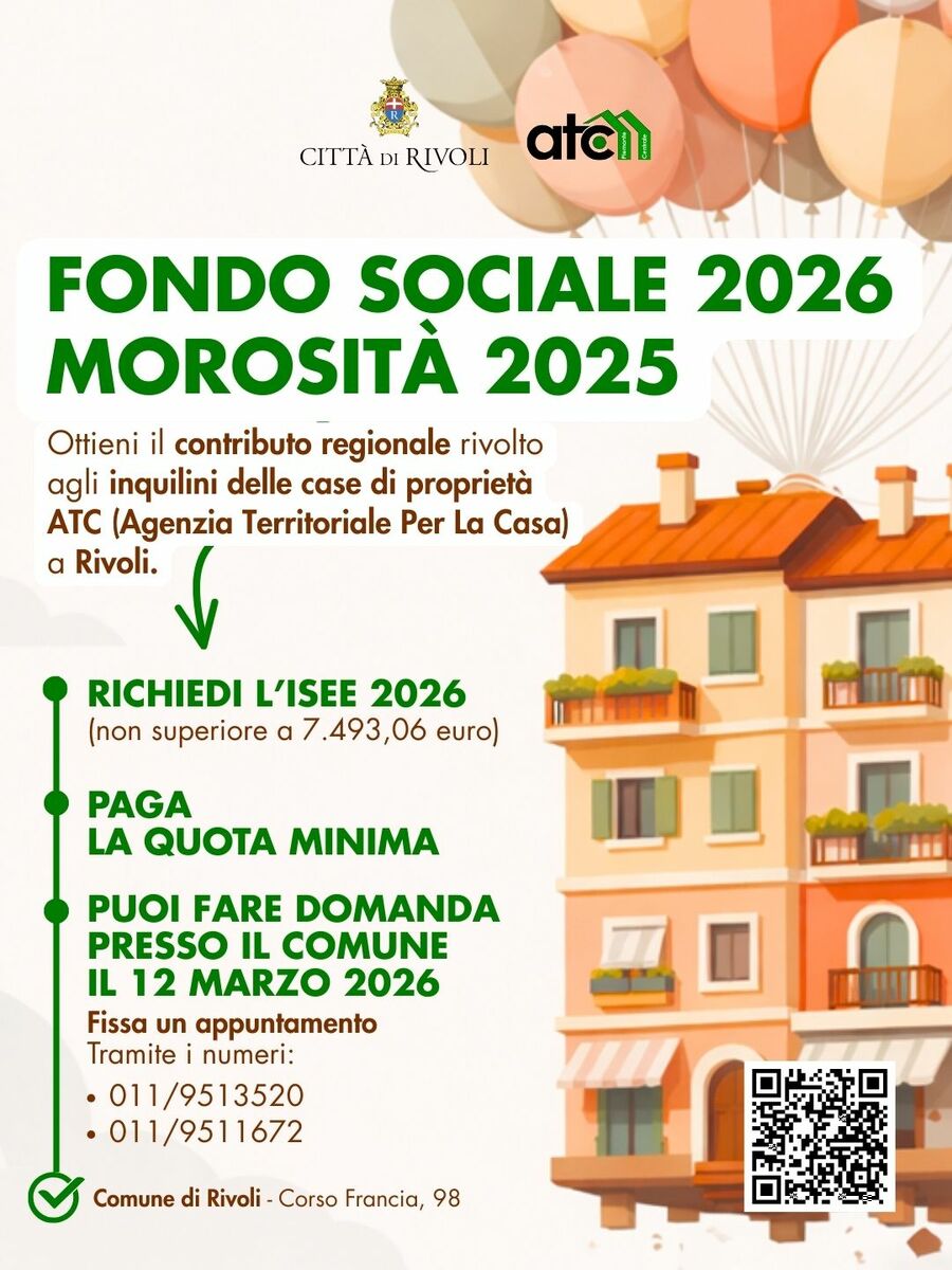 La Città di Rivoli apre i termini per l’accesso al Fondo Sociale Regionale 2026, la misura destinata agli assegnatari di alloggi ATC che hanno maturato morosità nel pagamento delle bollette relative all’anno 2025. Un intervento importante della programmazione abitativa regionale, pensato per sostenere le famiglie in difficoltà economica e allo stesso tempo garantire la regolarità dei rapporti locativi nell’edilizia pubblica.