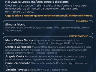 Proprio a questo tema sarà dedicato il panel “Legge 166: 10 anni contro lo spreco. E adesso?”, in programma sabato 15 marzo dalle 17.00 alle 18.30 nell’ambito di Horeca Expoforum, al Lingotto Fiere di Torino.