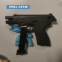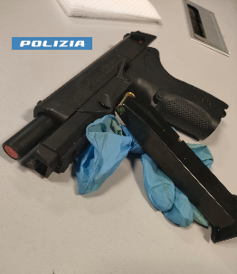 Dopo la perquisizione i poliziotti hanno rinvenuto, sopra un armadio della camera da letto, una pistola scacciacani modello “P4 Bruni” con tappo rosso, completa di caricatore e 11 munizioni a salve. L'arma e il relativo munizionamento sono stati sottoposti a sequestro.
