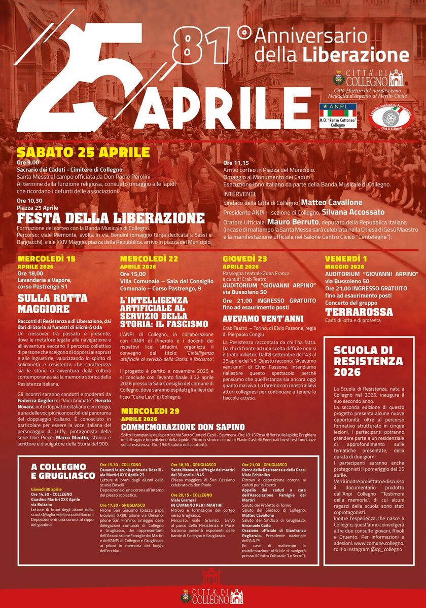 Le iniziative collaterali - come lo spettacolo “Avevamo vent’anni” di giovedì 23 aprile, testimoniano la volontà di Collegno di coniugare memoria e innovazione, coinvolgendo le nuove generazioni in un dialogo attivo sulla storia e sui valori costituzionali. O con la Scuola di Resistenza, nata nel 2025 e giunta al suo secondo anno, prosegue questo impegno con laboratori e incontri dedicati alla cittadinanza attiva e alla memoria storica.